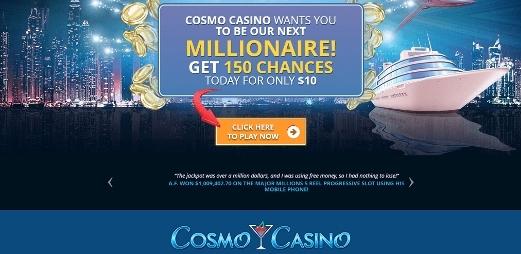 Bonus: New players at Cosmo Casino can receive up to 150 free spins on Mega Money Wheel video slot when they make their first deposit of $10 only.